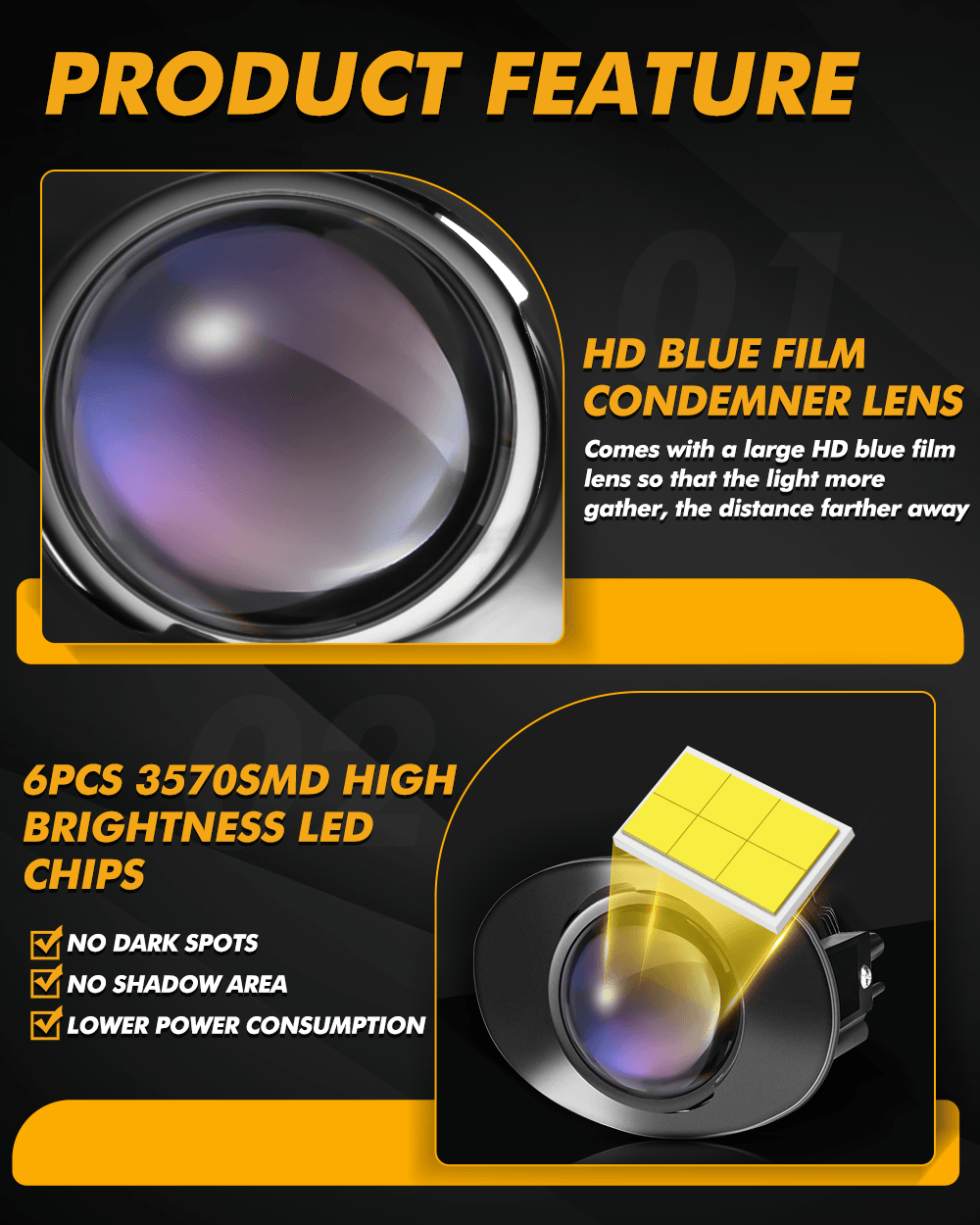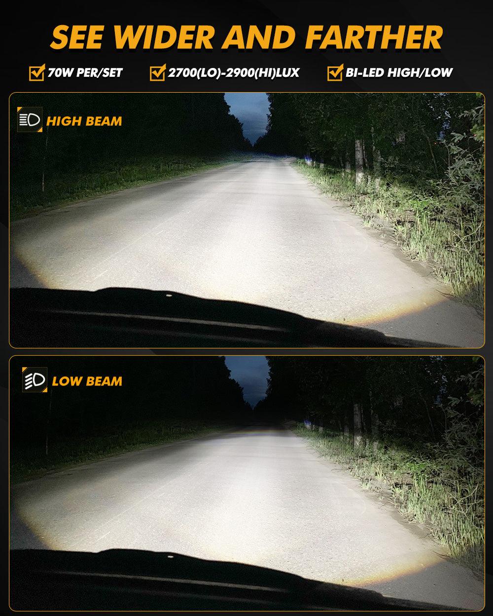 - استخدم رقائق LED SMD3570 وعدسات فيلم زرقاء عالية الدقة. بفضل إنتاجها العالي (70 واط/زوج) وتدفقها الضوئي العالي (2900 لومن)، تضمن لك أقصى مسافة إضاءة أمامية ورؤية واضحة، مما يزيد من أمان قيادتك.