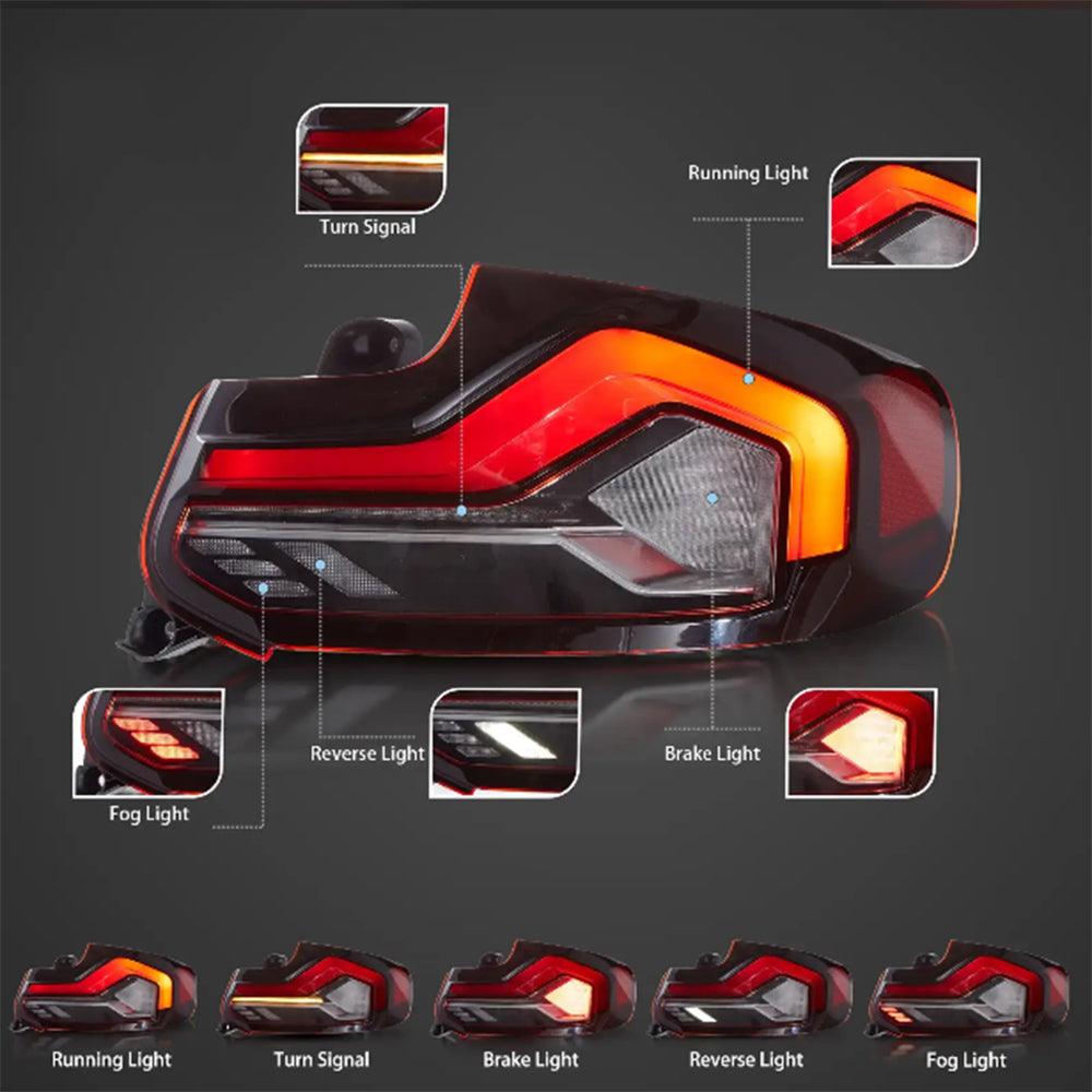 مع رسوم متحركة لبدء التشغيل ومؤشر متسلسل لإشارة الانعطاف + ضوء فرامل LED أحمر + ضوء فرامل LED + ضوء تشغيل LED أحمر + ضوء ضباب LED + ضوء عكسي LED ساطع