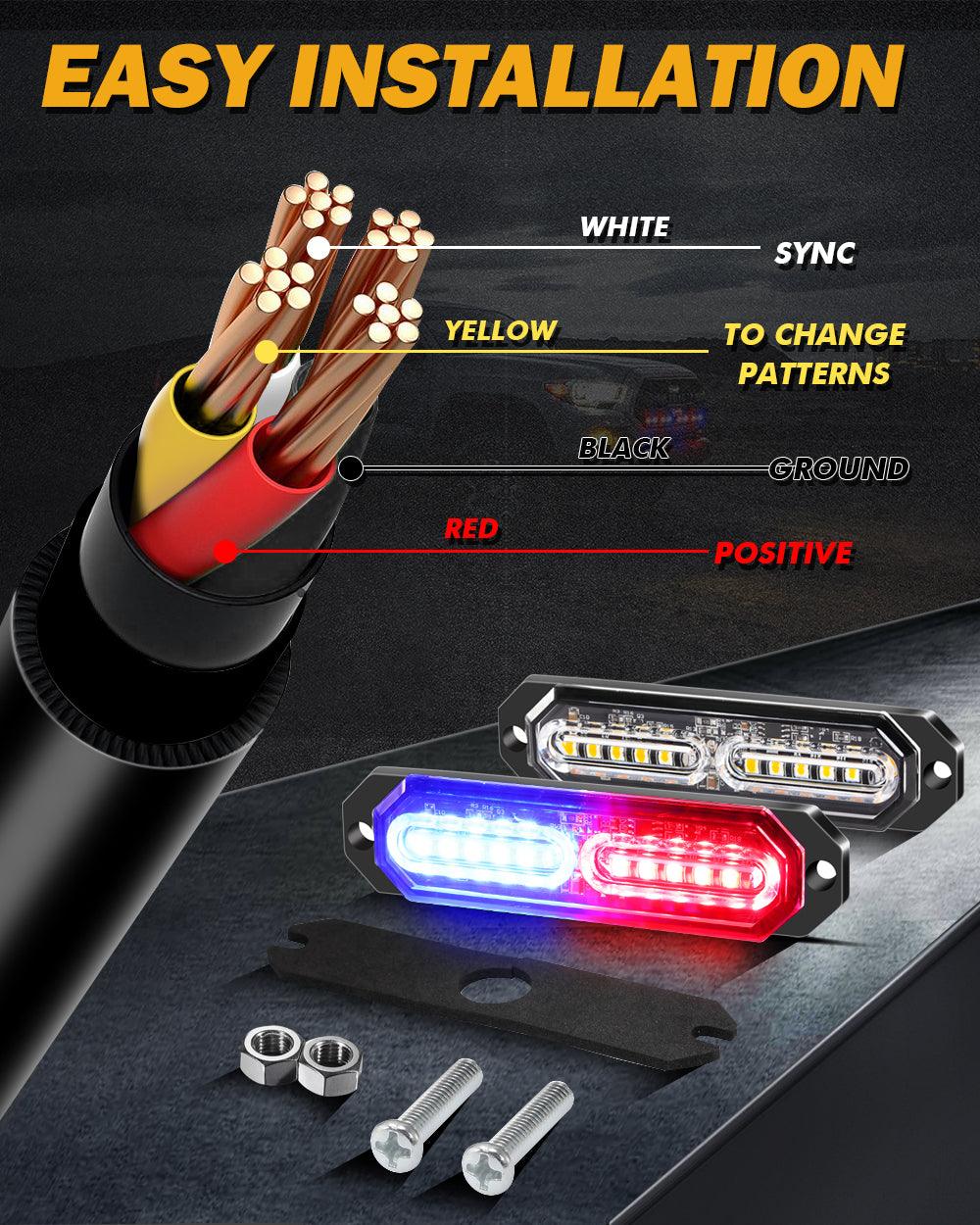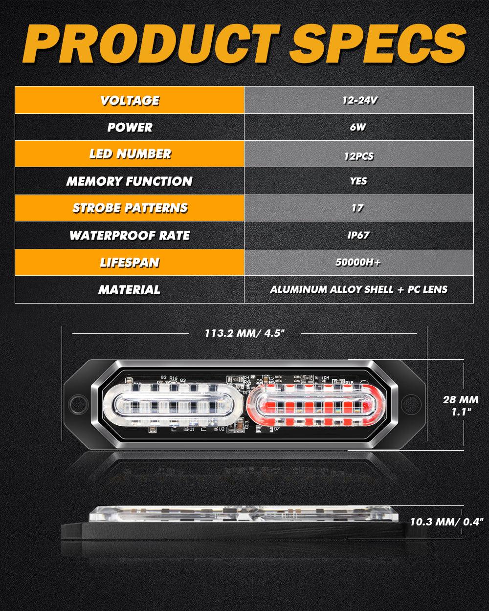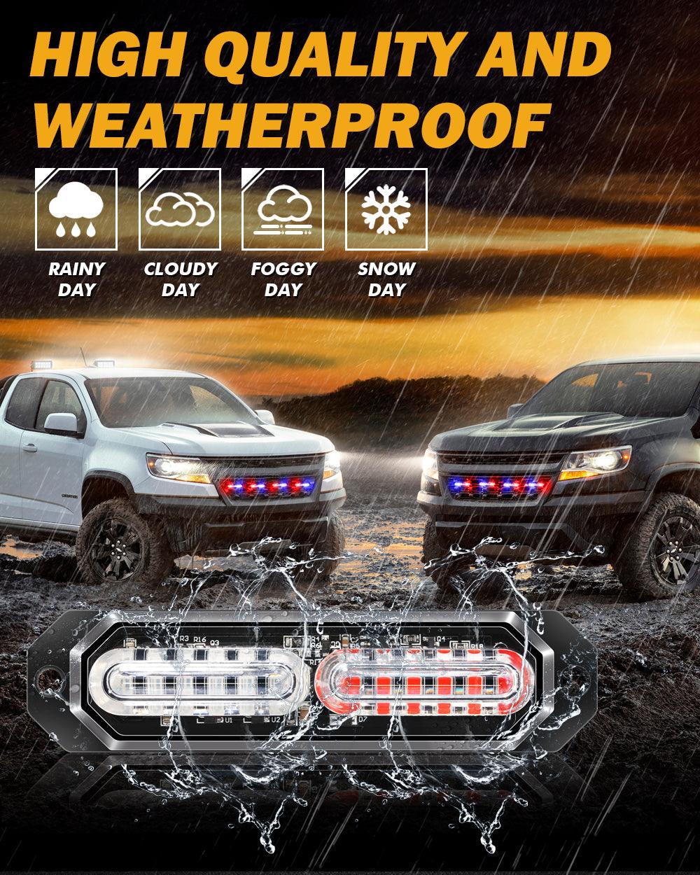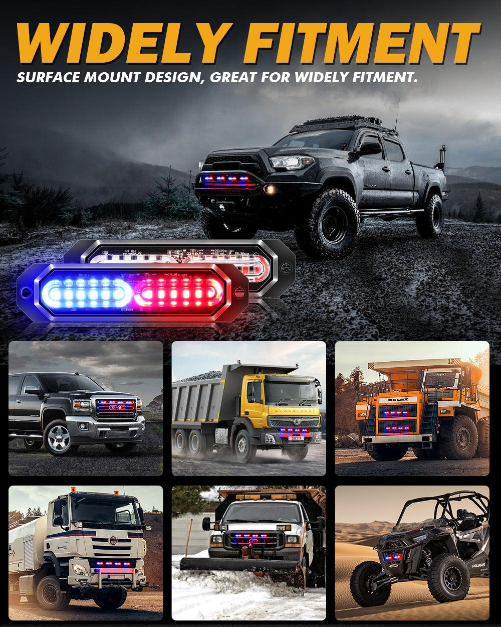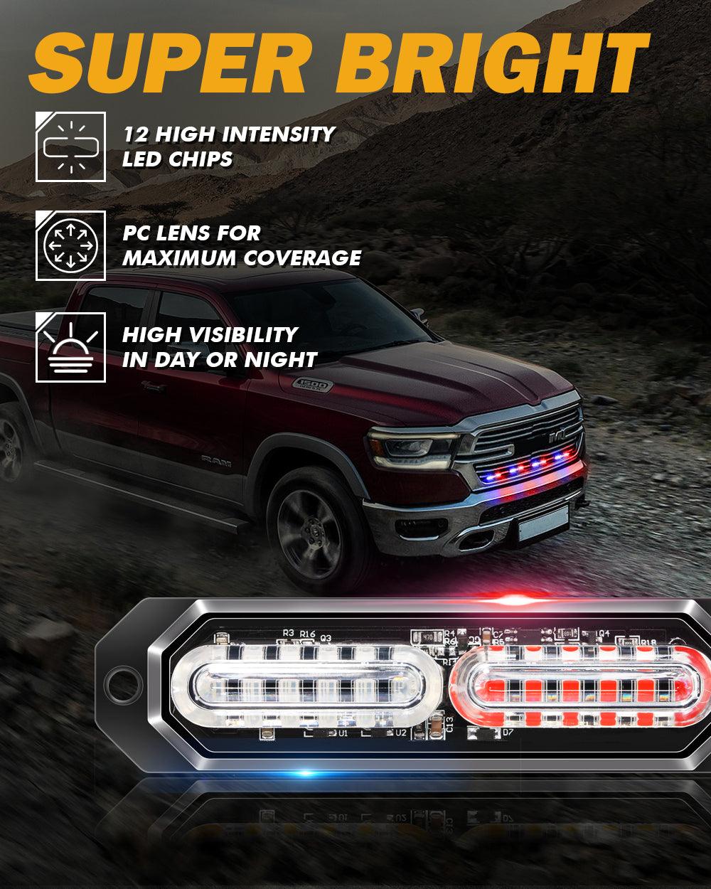 【وضوح فائق】: 4 قطع من مصابيح ستروب AUXBEAM، 12 مصباحًا، مثبتة على السطح، كل مصباح يحتوي على 12 رقاقة LED عالية الكثافة. استخدم غلافًا من سبائك الألومنيوم وعدسة PC لتوفير أقصى تغطية ووضوح عالي ليلًا ونهارًا. سطوع ممتاز لتحسين السلامة والأمان.