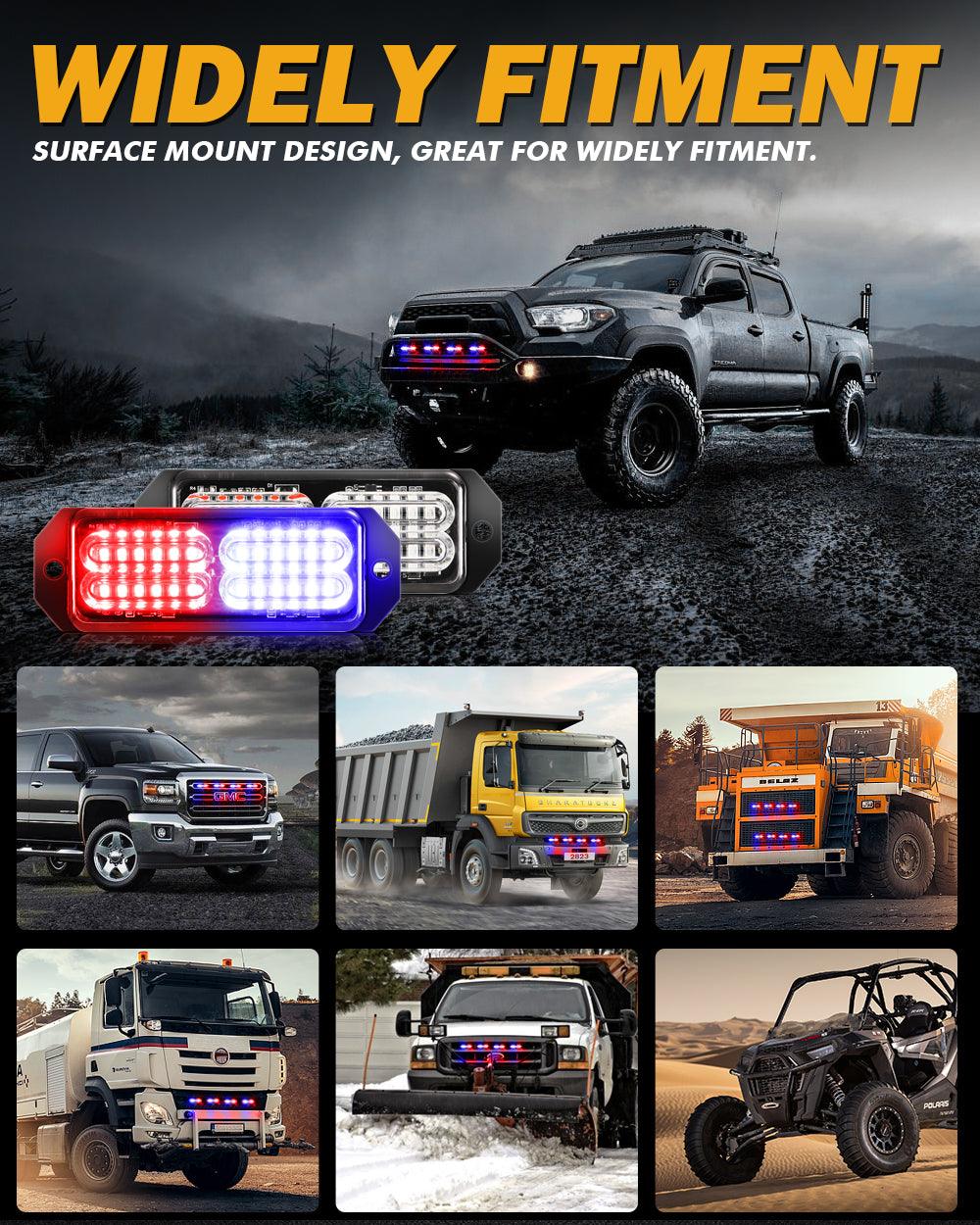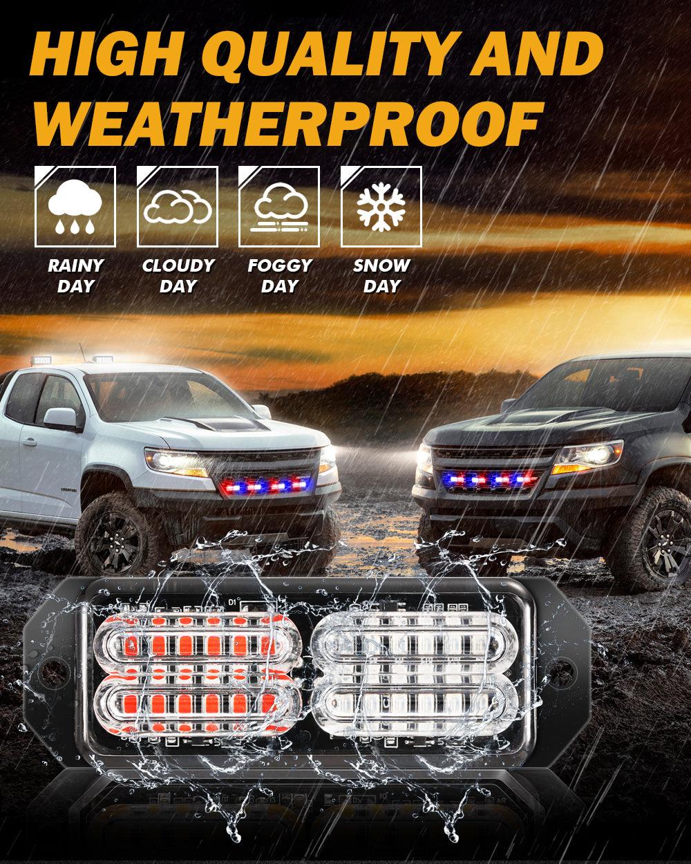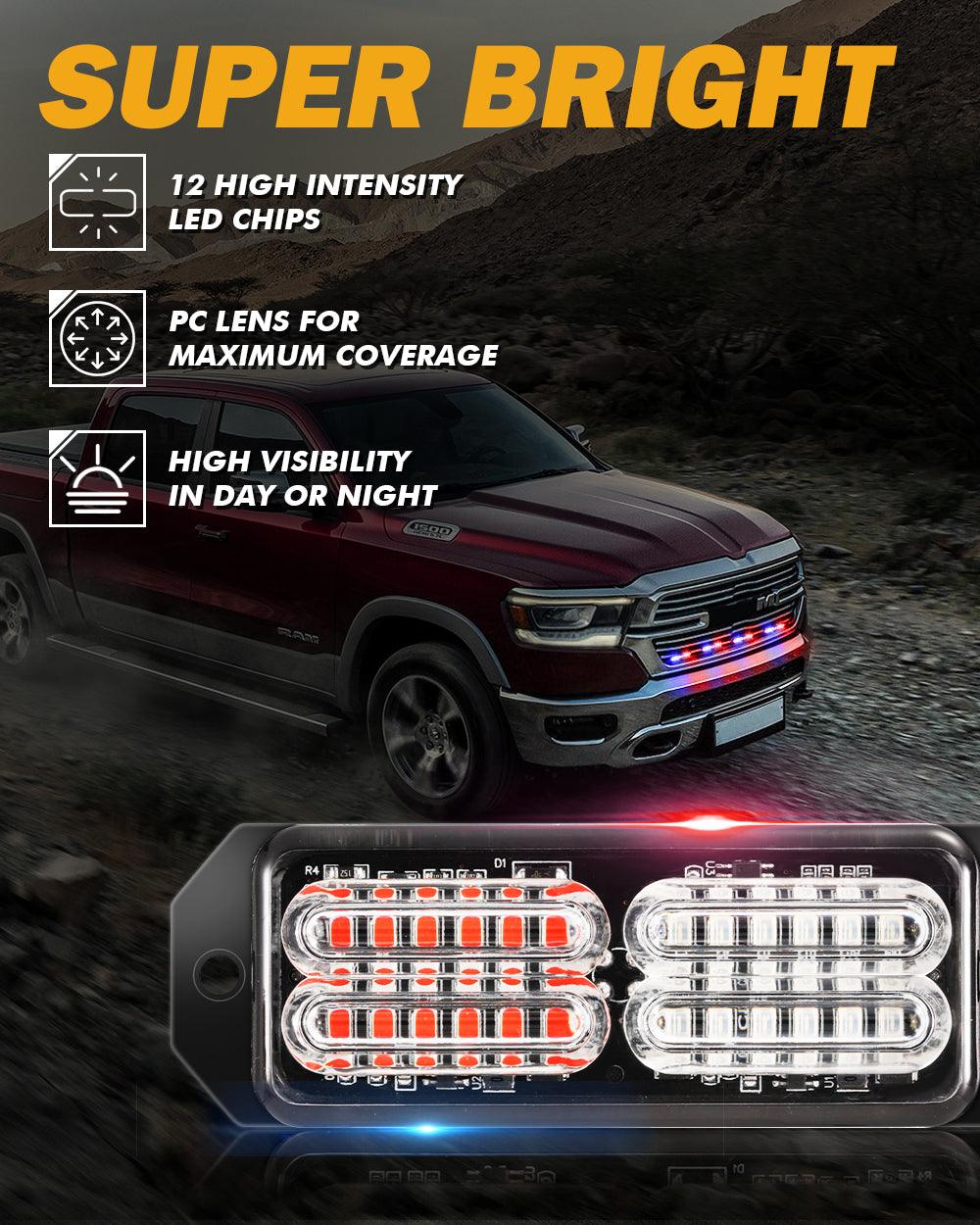 【رؤية فائقة】: 4 قطع من مصابيح ستروب AUXBEAM، 24 مصباحًا سطحيًا، كل مصباح مزود بـ 12 رقاقة LED عالية الكثافة. استخدم غلافًا من سبائك الألومنيوم وعدسة PC لتوفير أقصى تغطية ورؤية عالية ليلًا ونهارًا. سطوع ممتاز لتحسين السلامة والأمان.