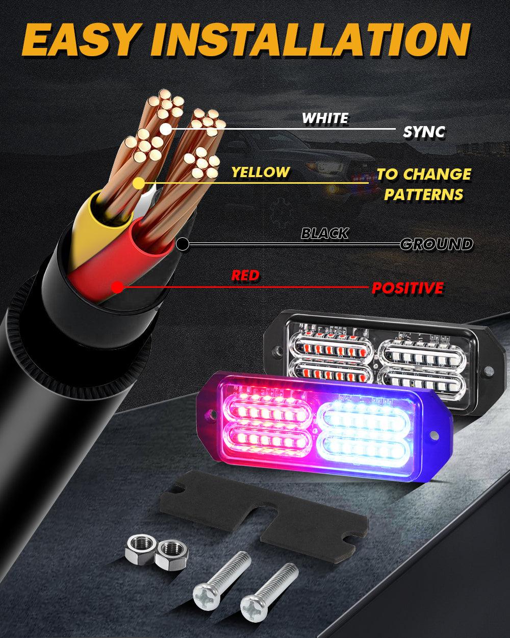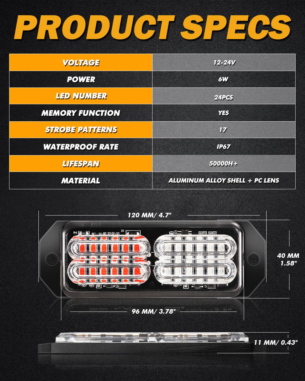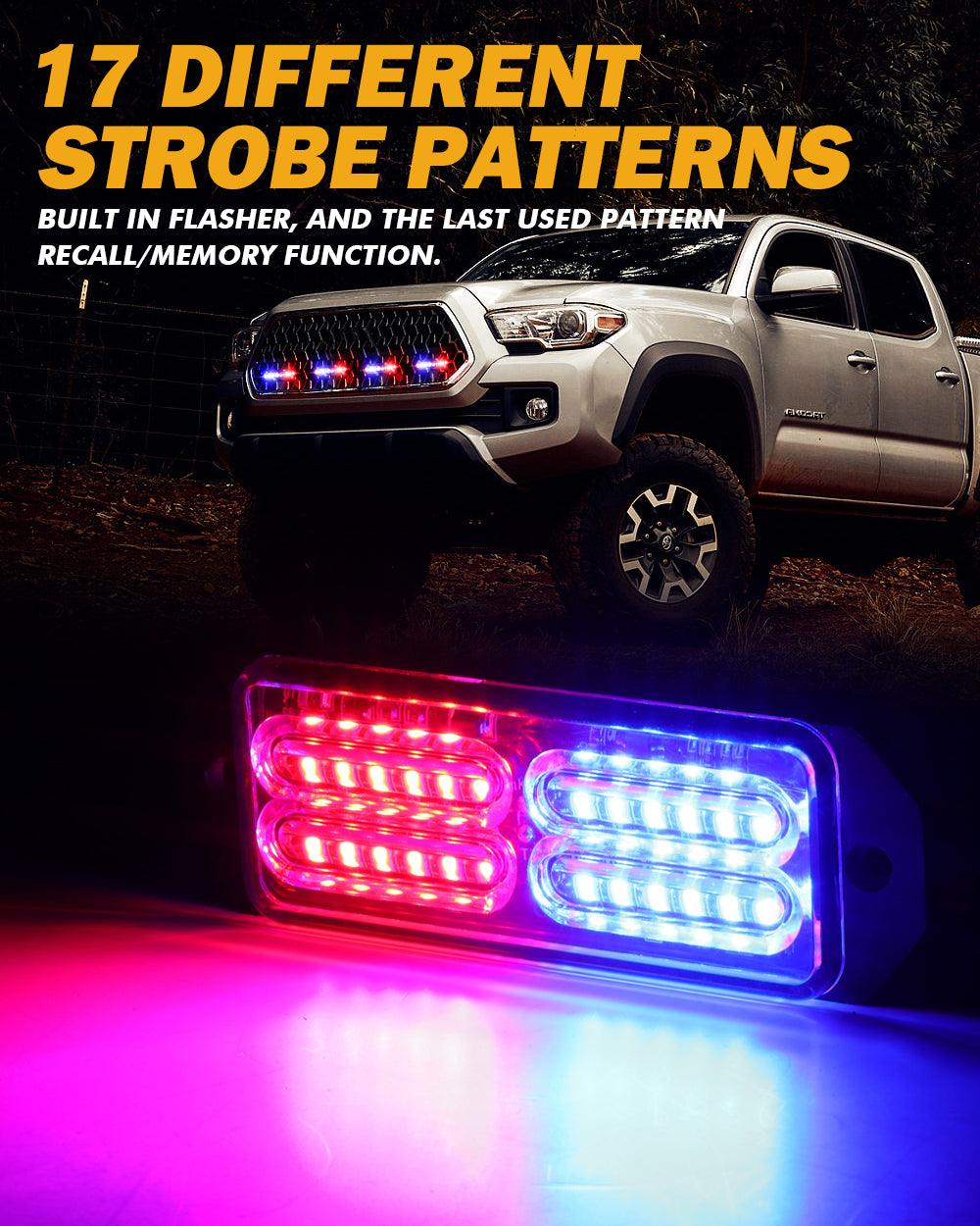 【رؤية فائقة】: 4 قطع من مصابيح ستروب AUXBEAM، 24 مصباحًا سطحيًا، كل مصباح مزود بـ 12 رقاقة LED عالية الكثافة. استخدم غلافًا من سبائك الألومنيوم وعدسة PC لتوفير أقصى تغطية ورؤية عالية ليلًا ونهارًا. سطوع ممتاز لتحسين السلامة والأمان.