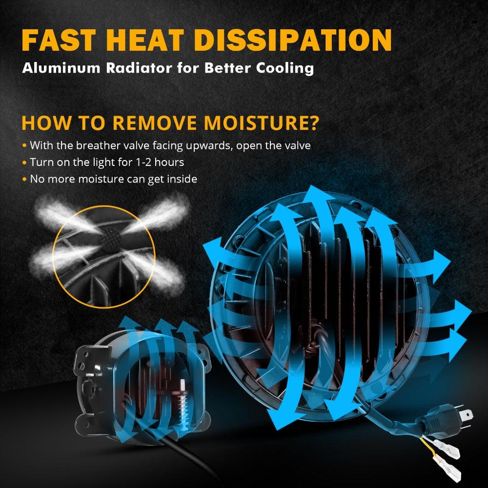 أوضاع إضاءة مُدمجة: تُوفر مصابيح LED الأمامية مقاس 7 بوصات أربعة أوضاع إضاءة مُختلفة: هالة بيضاء للإضاءة النهارية، هالة كهرمانية لإشارة الانعطاف، شعاع عالي وشعاع منخفض. كما تُوفر مصابيح الضباب LED مقاس 4 بوصات ثلاثة أوضاع إضاءة: هالة بيضاء للإضاءة النهارية، وإشارة انعطاف كهرمانية. تُلبي مجموعة مصابيح LED الأمامية ومصابيح الضباب هذه جميع احتياجاتك من الإضاءة للقيادة اليومية.