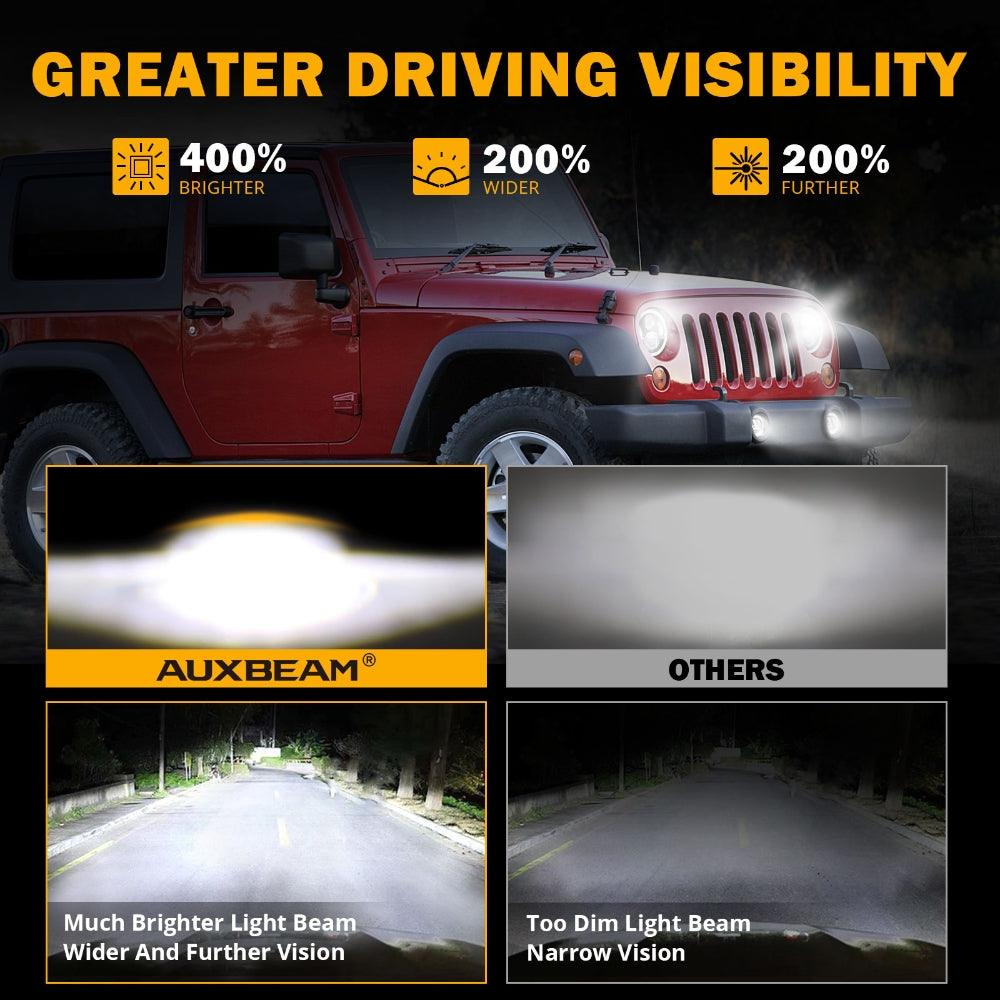 مصابيح أمامية JK مُحسّنة + مصابيح ضباب: مصابيح أمامية LED دائرية مقاس 7 بوصات ومصابيح ضباب LED دائرية مقاس 4 بوصات مزودة برقائق LED مُخصصة ومتطورة لسطوع فائق. يُوفر هذا المزيج من مصابيح Auxbeam jk الأمامية ومصابيح الضباب شعاع ضوء أكثر تركيزًا بدون نقاط عمياء، مما يُحسّن الرؤية ورؤية القيادة، ويُعزز سلامتك على الطريق. بالإضافة إلى ذلك، تحتوي على نظام مُضاد للوميض، لذا لن تضطر إلى التعامل مع تداخل الراديو أو مشاكل الوميض كما هو الحال مع المصابيح الأمامية الأخرى المُشابهة.