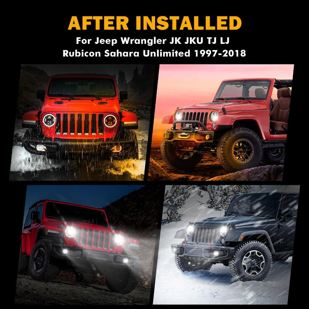 مجموعة مصابيح أمامية LED مقاس 7 بوصات + مصابيح ضباب LED مقاس 4 بوصات مع إشارة انعطاف هالة DRL عالية ومنخفضة الشعاع لسيارة جيب رانجلر JK JKU TJ LJ Rubicon Sahara Unlimited 1997-2018