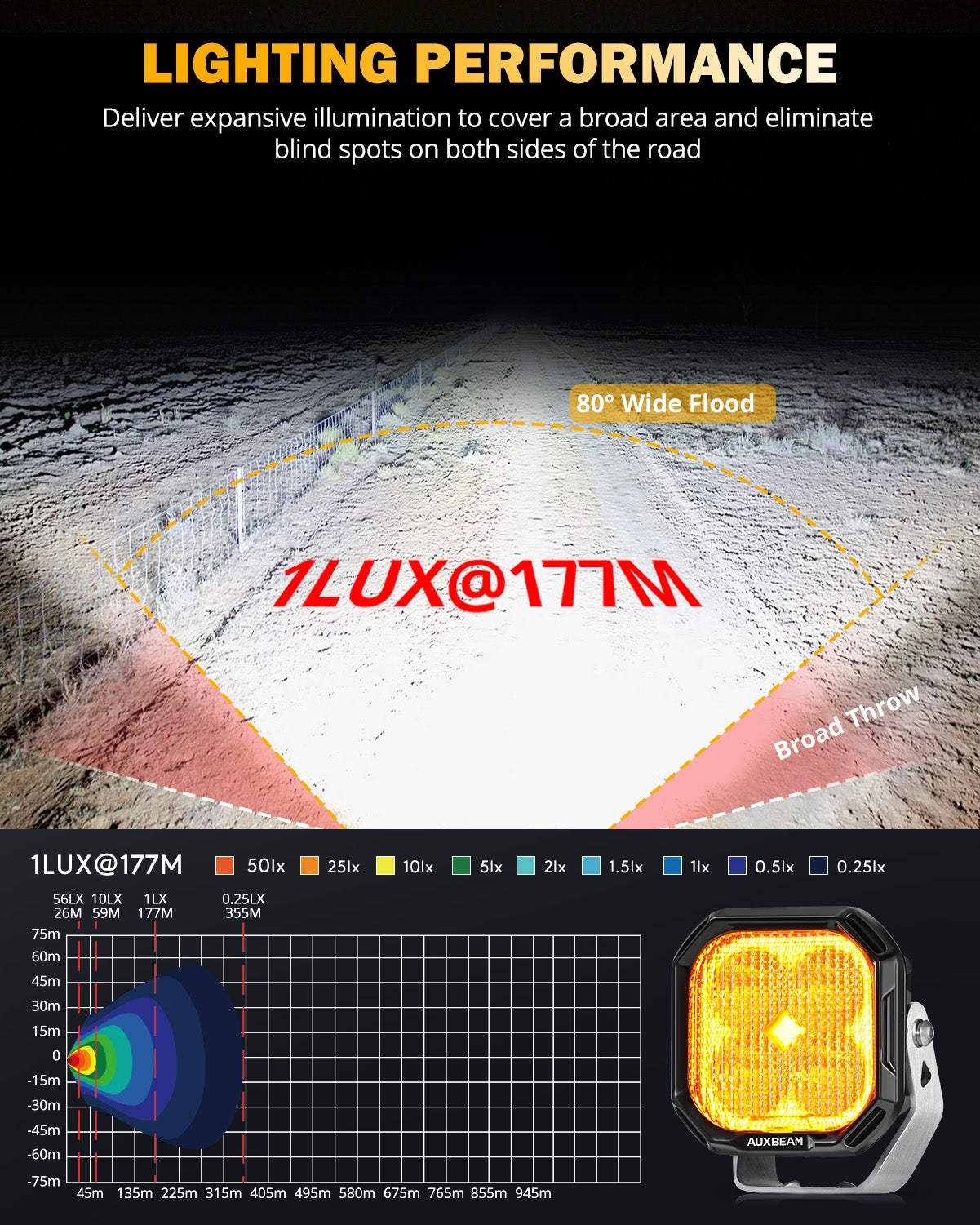 رؤية قيادة ثاقبة: تتميز مصابيح LED متعددة الوظائف بنوعين من مصابيح LED. بقوة خرج 100 واط، توفر 11600 لومن ومسافة إضاءة تبلغ 1 لوكس عند 177 مترًا. يُصدر هذا المصباح الكاشف شعاعًا واسعًا ومنتشرًا يغطي مساحة أكبر. هذا مثالي للقيادة بسرعات منخفضة، حيث يُضيء مجال رؤية أوسع، ويُعزز الرؤية المحيطية.