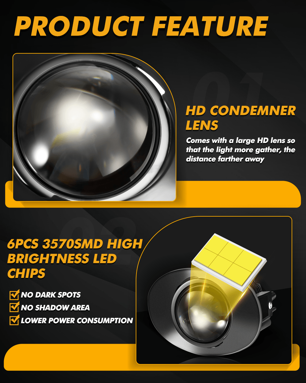- يعتمد على رقائق LED SMD3570 وعدسات زجاجية عالية الدقة. بفضل إنتاجيته العالية (70 واط/زوج) وتدفقه الضوئي العالي (2900 لومن)، يحقق أقصى مسافة إضاءة أمامية ورؤية واضحة، مما يزيد من أمان قيادتك.