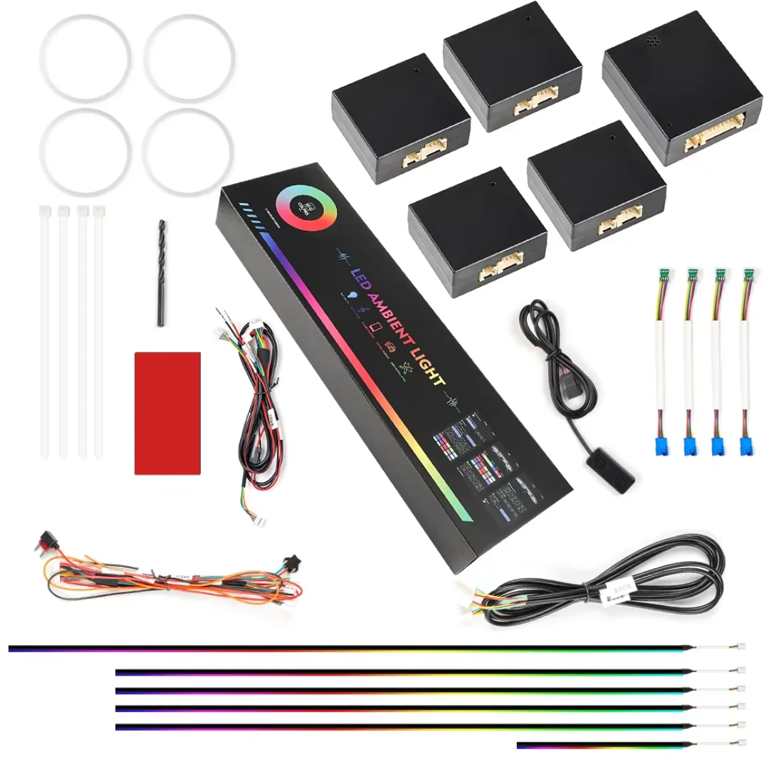 غيّر أجواء سيارتك مع طقم إضاءة LED الداخلية. بفضل إضاءتها RGB متعددة الألوان المتزامنة مع الموسيقى، تخلق جوًا فريدًا وشخصيًا داخل سيارتك.