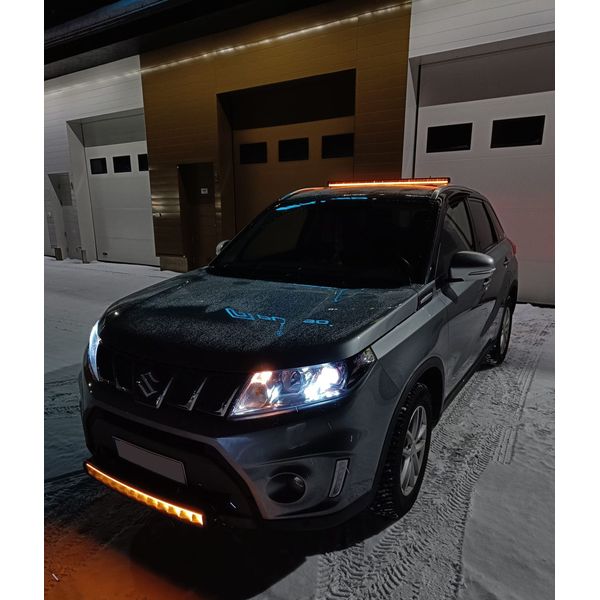 Panneau lumineux auxiliaire élégant avec un corps mince, incurvé et bas (hauteur 40 mm), un feu de stationnement dynamique bicolore et deux modes d'alimentation différents. Rendement lumineux mesuré 13758 lm, portée mesurée 459 m à 1 lux.