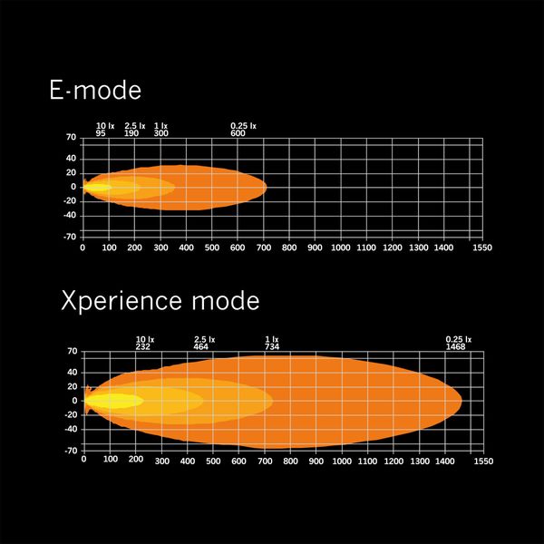 Panneau d'éclairage auxiliaire élégant et discret avec, entre autres, deux modes d'alimentation, un faisceau combiné large et des feux de stationnement orange et blancs. Puissance lumineuse indiquée 10950 lm, portée 734 m à 1 lux.