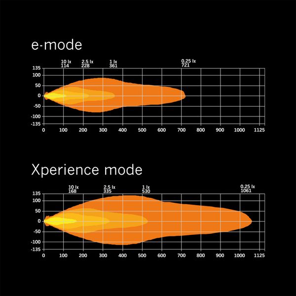 Une barre LED mince et incurvée avec un corps bas, deux modes d'alimentation, un large faisceau lumineux combiné et un feu de stationnement jaune et blanc. Rendement lumineux déclaré 13700 lm, portée 530 m à 1 lux. Non homologué E !