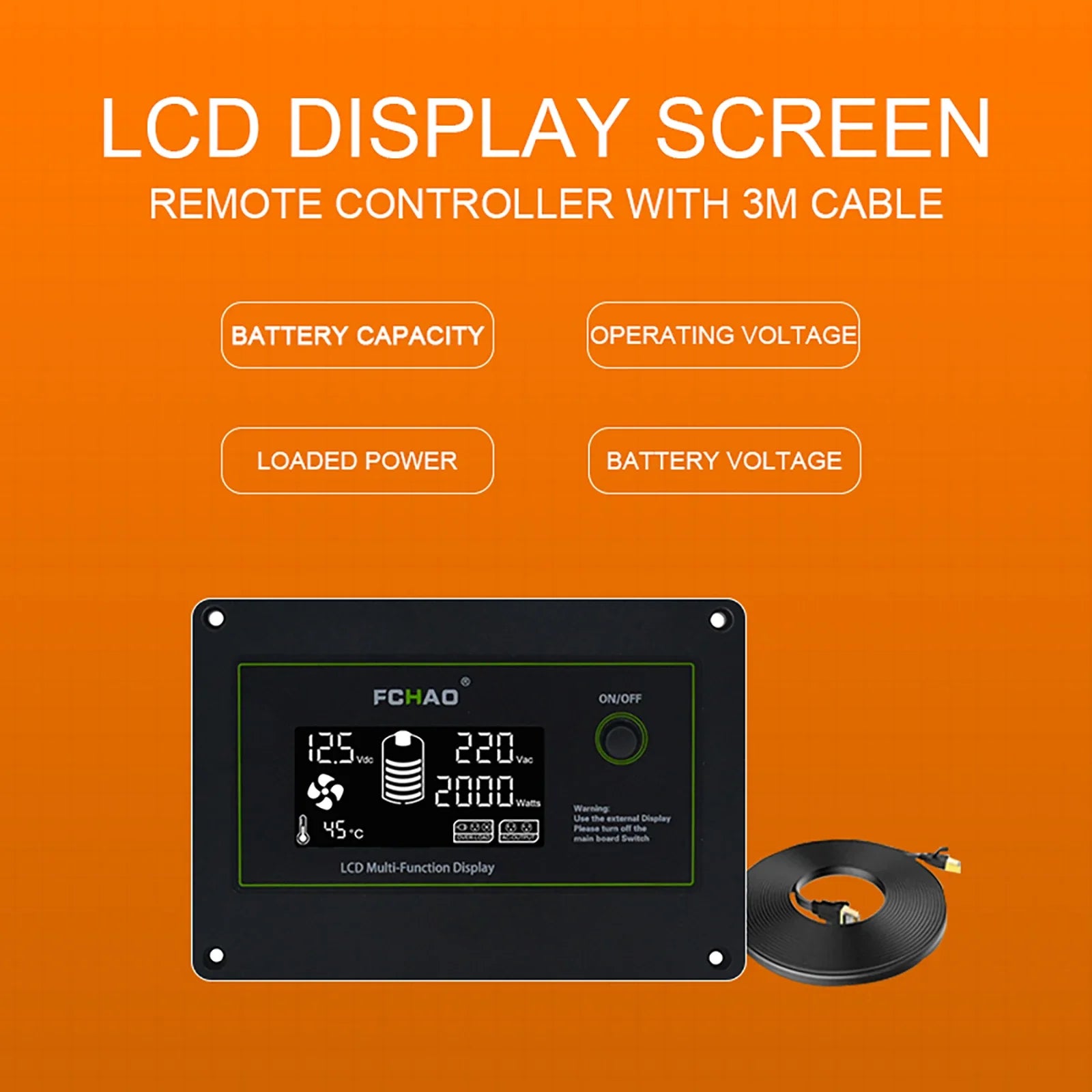 4. يمكن توصيل الكابل بطول 3 أمتار بلوحة العرض، والتي لا يمكنها التحكم في تشغيل وإيقاف العاكس فحسب، بل تعرض أيضًا الجهد الحالي والطاقة