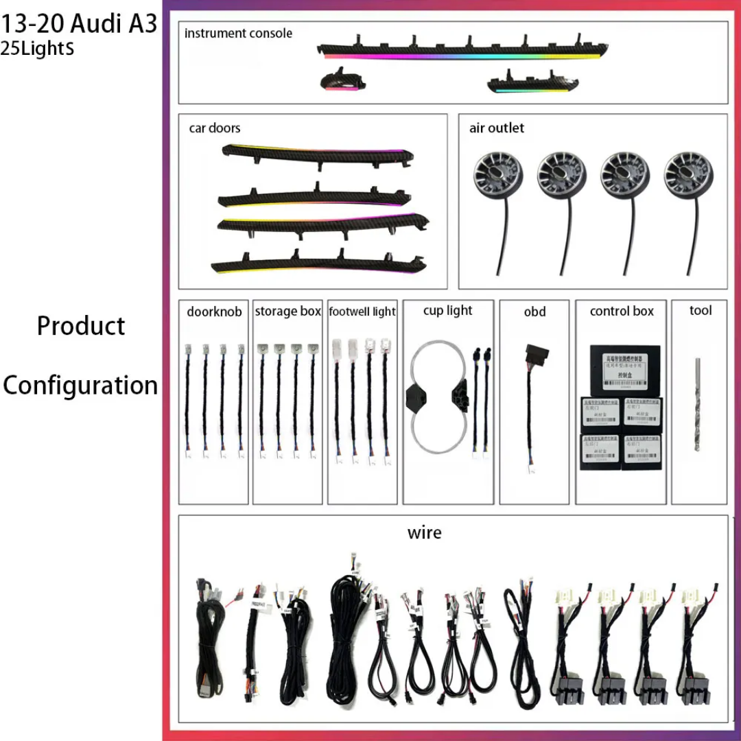 This "Dragon Scale" interior LED kit is designed to enhance the interior of your Audi A3 (Sportback, Sedan or S3 - 2013 to 2020). Enjoy RGB lighting controllable via smartphone for a unique ambiance on every journey.