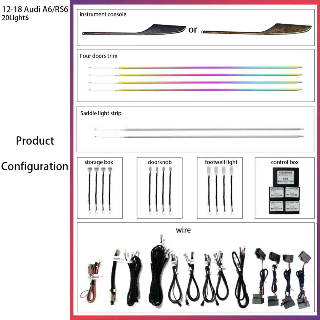 This "Dragon Scale" interior LED kit is designed for the Audi A6 (C7 – from 2012 to 2018). It transforms your interior into a modern, elegant, and fully customizable space, controllable directly from your smartphone.