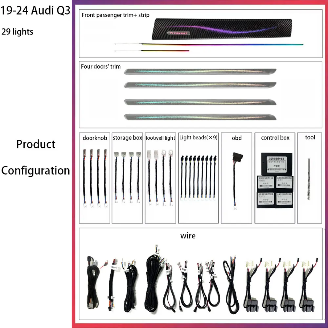 This "Dragon Scale" LED kit transforms the interior of your Q3 (2019 to 2024) with smart, stylish, and fully customizable RGB lighting. Perfect for a modern look, day and night.