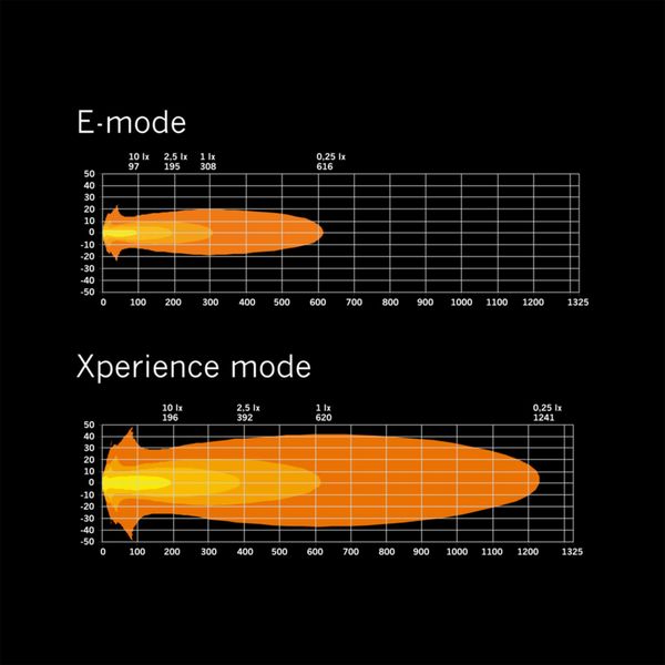 Feu auxiliaire de 7" avec une apparence unique, deux modes d'alimentation et un feu de stationnement jaune et blanc. La lumière a une température de couleur agréable à l'œil de 5700K et un motif lumineux combiné optimisé pour une utilisation en véhicule. Puissance lumineuse déclarée 7430 lm, portée 620 m à 1 lux.