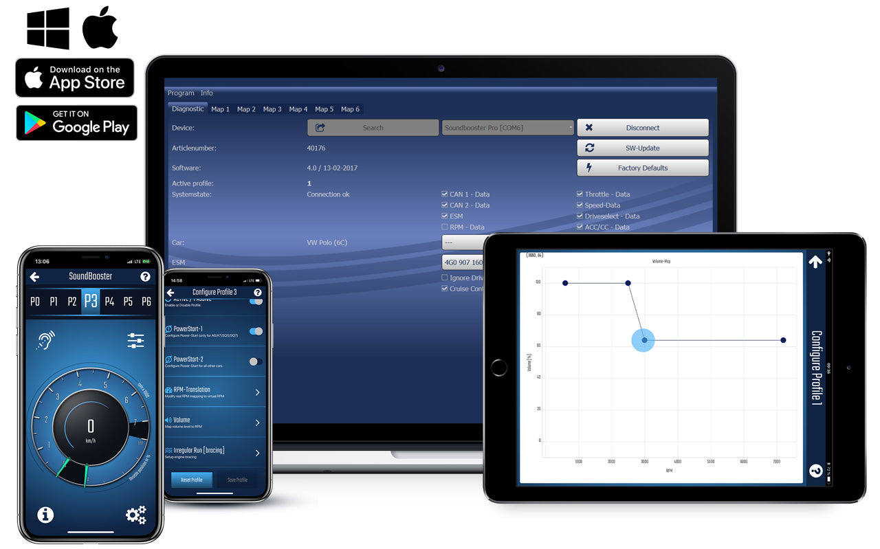 The Sound Booster Pro simulates a high-volume engine (V6/V8) or develops its own unique sound characteristics. With this active audio system, you get a powerful engine and exhaust sound at the touch of a button. KUFATEC offers the Sound Booster Pro for almost all car makes and models. A CAN bus system is a prerequisite. This vehicle-specific kit for the VW Amarok 2H includes the sound generator with a mounting bracket tailored to your vehicle model, eliminating the need for welding or drilling. The system at a glance: This system is known from Audi, where it is factory-installed on every 313 hp TDI engine. The sound generator simulates a high-volume engine and partially attenuates the typical TDI tone. No exhaust system can achieve this sound. The KUFATEC Sound Booster Pro gives the entire system a unique sound. A powerful V6/V8 engine sound (depending on settings). LED status indicator for trouble-free installation. Control and profile settings: Choose between up to 6 sound profiles. Profile 1 provides a very subtle sound for noise-sensitive areas. Optional profile switching with: the integrated push button. Optional remote control with vehicle-integrated control options, e.g., cruise control. With the "KUFATEC Link" mobile app, adjust profiles and diagrams with the free software or the free mobile app. The push button must be installed at the front (e.g., at the driver's feet). However, this does not necessarily have to be installed. Before purchasing: Please download the installation manual before purchasing the product and check if your car offers enough space for the sound generator in the designated location under the car body. In some cases, the designated position on the car's underbody may not offer sufficient space due to different equipment and variants of the same car model. Selectable options: PRO EXTENDED. With the PRO version, you get the Audi control unit as an external sound module (ESM), and the Maserati ESM with the EXTENDED version. Scope of delivery: control unit for engine sound generation (Audi or Maserati ESM), external sound generator incl. mounting plate, Sound Booster Pro (module), cable set. Note: This product is not approved for use on public roads - for racing purposes only. Please download the instructions before purchasing and check the clearance on the car's undercarriage. Currently tested on TDI engines; petrol engines available upon request.