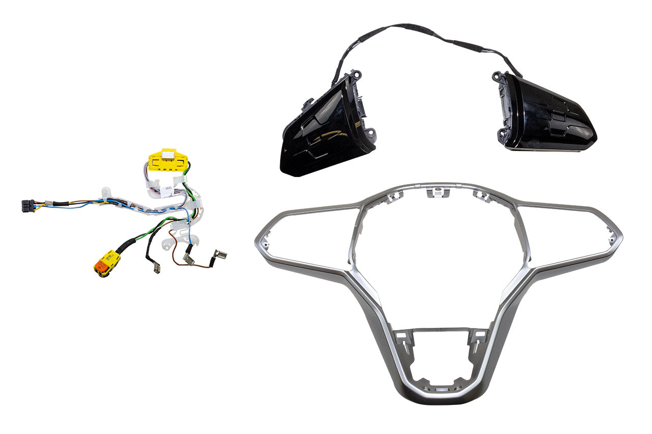 Kit complet pour la mise à niveau des boutons multifonctions d'origine Touch (MFL) pour VW T6.1 SH Toutes les options de fonctionnement du MFL installé en usine sont conservées Les boutons tactiles offrent les points forts suivants : aspect et sensation modernes, noir brillant fonctionnement plus rapide, en particulier l'infodivertissement en volume éclairage des boutons uniquement après contact mis, sans allumage "optique noire" plus de boutons simples, donc pas de pénétration d'impuretés Option sélectionnable : sans ACC (PR-No.: 8T6) avec ACC (PR-No.: 8T7, 8T8) Contenu de la livraison : Boutons VW Touch MFL Jeu de câbles Clé de codage Remarques : Convient uniquement aux véhicules avec volant multifonction (PR-No.: 2FD) Véhicules sans volant multifonction (PR-No.: 1MM) sur demande