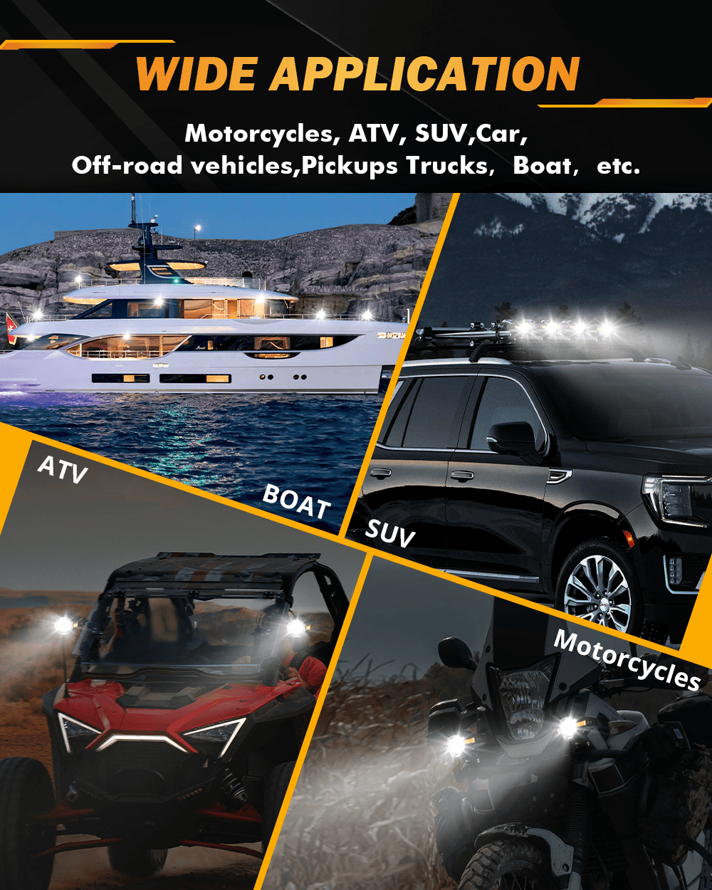 - The housing of the LED motorcycle spotlight is made of die-cast aluminum, Fast heat dissipation, enhances the light's lifespan by over 50,000 hours. IP67 waterproof grade can be used in any bad weather.