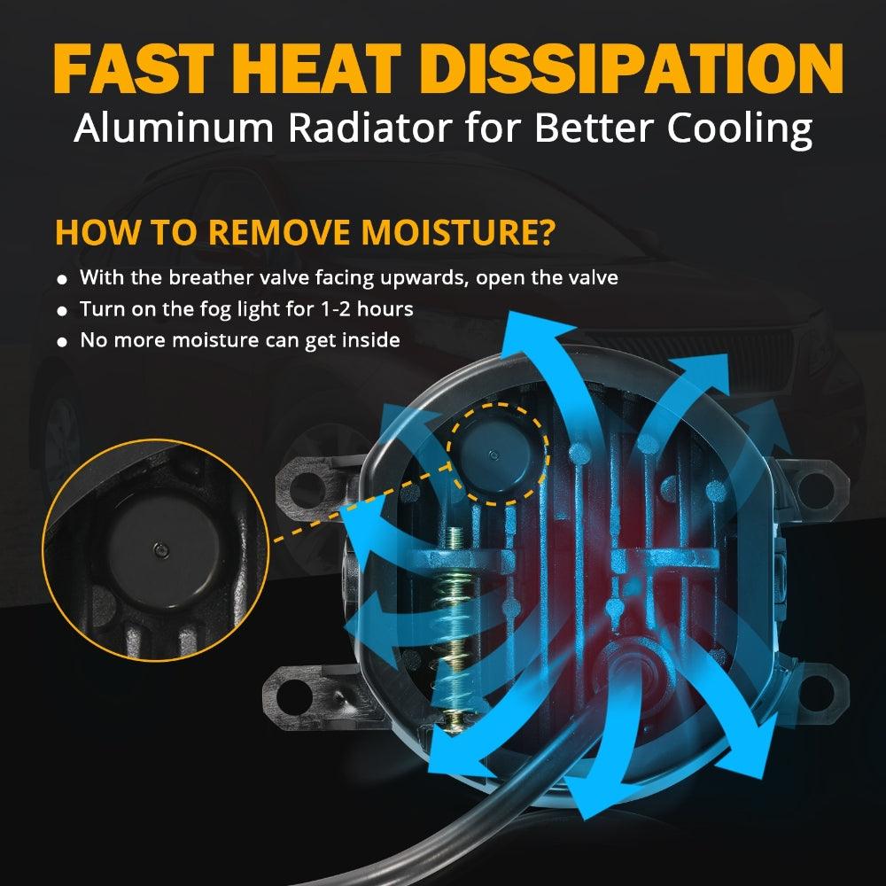 BUILT TO LAST: The fog lamp body is made of die-cast aluminum material and the lens is made of sturdy PC. With breathing holes, it disperses internal fog better and has excellent heat dissipation, greatly extending the lifespan of the LED fog lights. They're IP67 waterproof, and the light cup sealing rubber ring provides better waterproof and dustproof effects, so you don't have to worry about harsh environments.