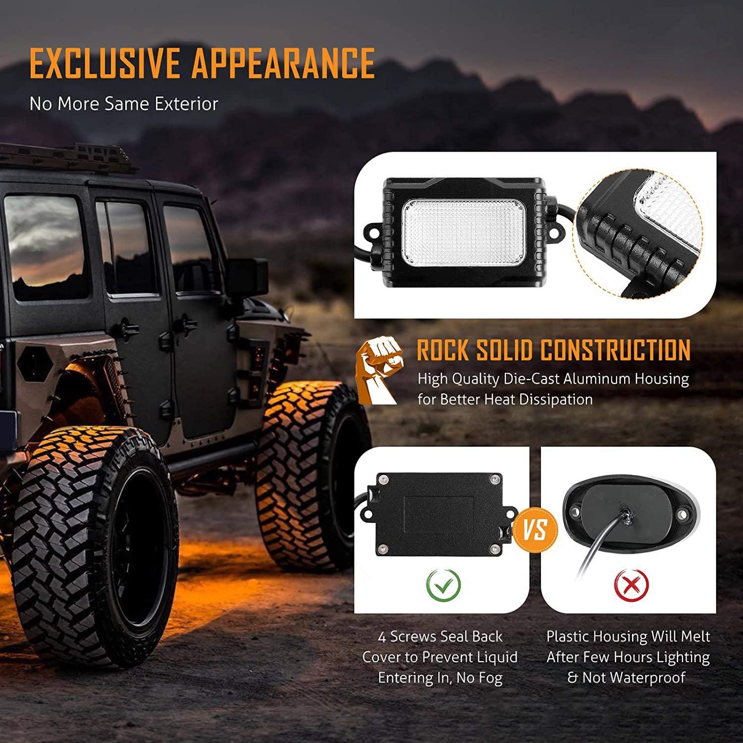 - The Real White Color. Auxbeam RGB underglow rock light kit, not just RGB neon lights, but better real white color rock lights, road lighting lights when necessary.