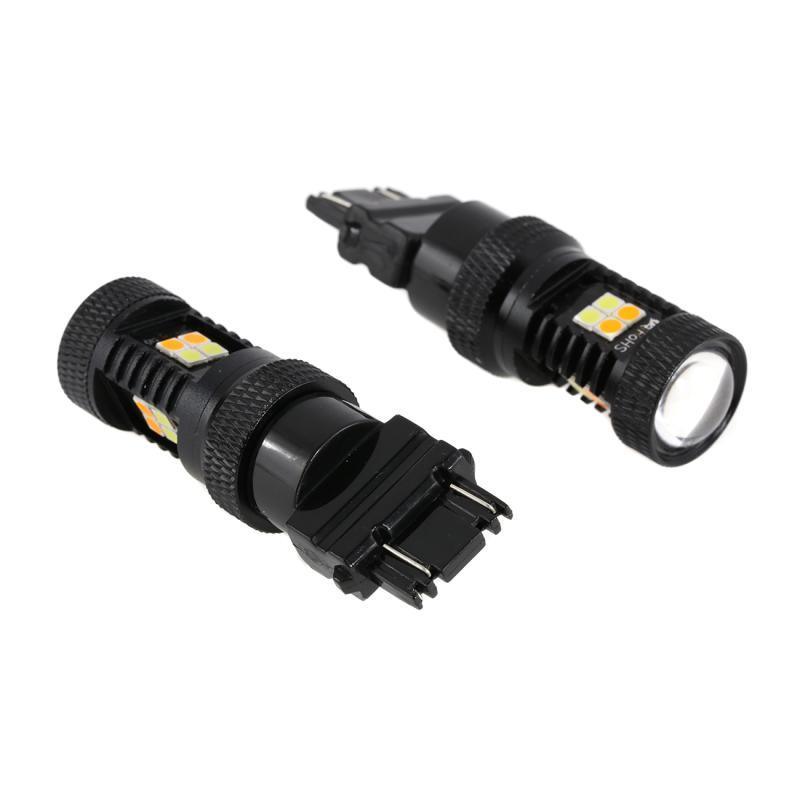 This 3157 Switchback LED lights light up xenon white for parking lights or daytime running lights (DRL lights); Light up amber yellow for turn signal lights and returns to white once turn signal is deactivated.