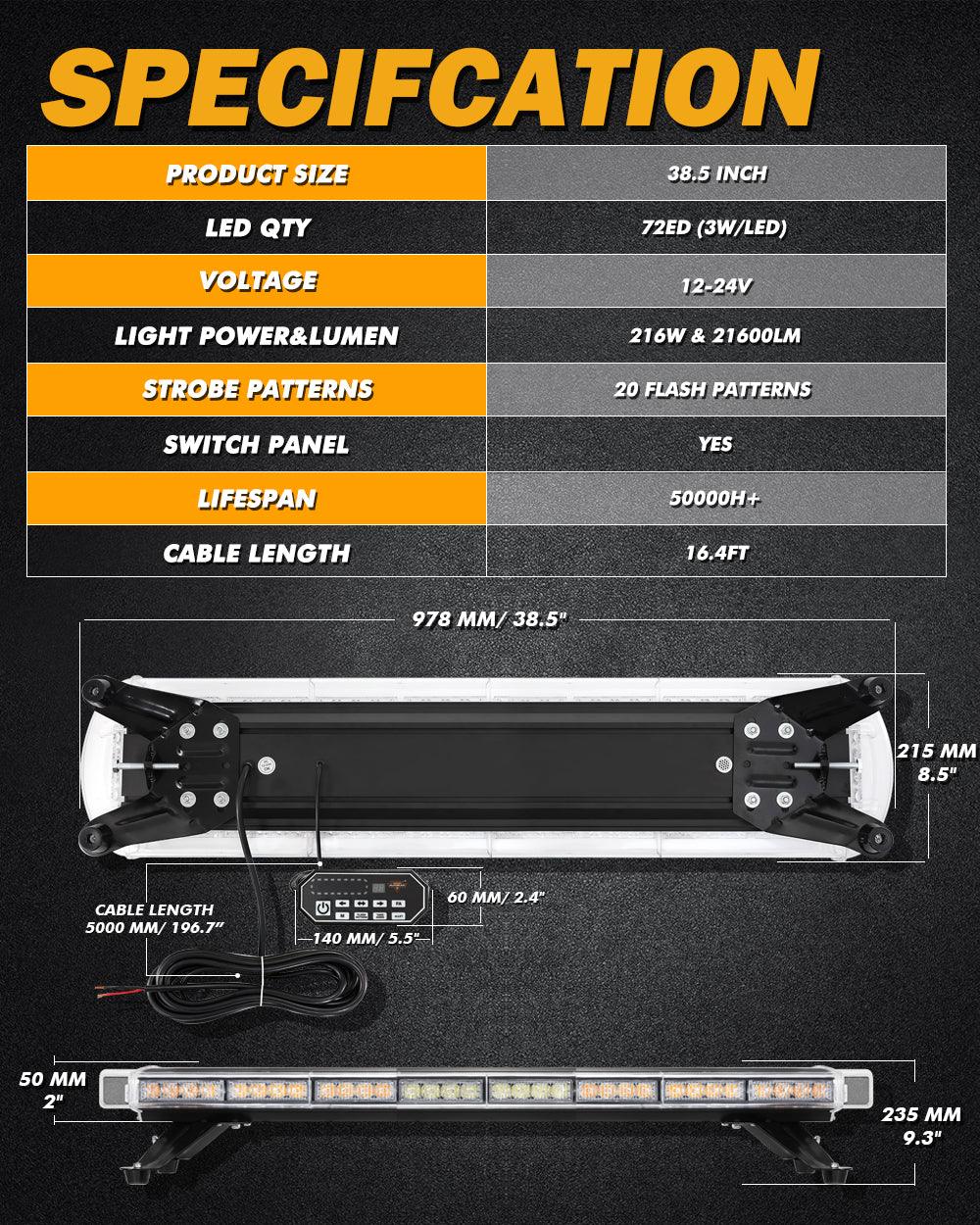 Perfect Bright: This emergency flashing light bar has a total of 72 high-power 3W LED chips. Crystal clear lens for max brightness, visible day and night. Great for law enforcement cars, plow trucks, construction vehicles, tractors, security, snowplow, postal, mail carrier, and city service workers, to warn of potential hazards.