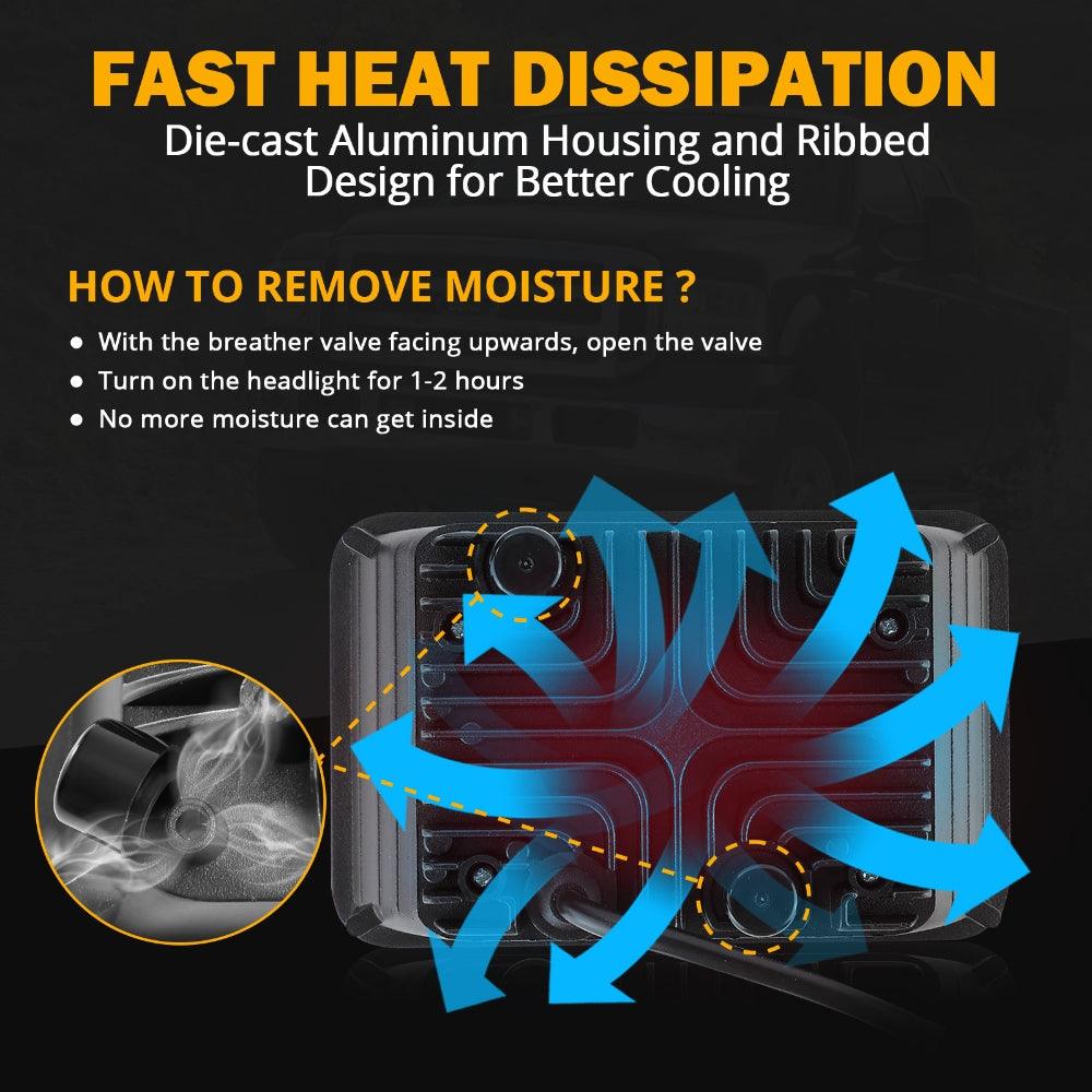 BUILT TO LAST: These 4x6 inch headlights are designed with an IP67 waterproof rating, making them usable in various harsh weather conditions like heavy rain, fog, or snowstorms. More importantly, the thick aluminum shell and heat dissipation design on the back effectively maintain a stable working temperature for the headlights, giving them a lifespan of over 50,000 hours. So, you don't have to worry about replacing your headlights anymore.