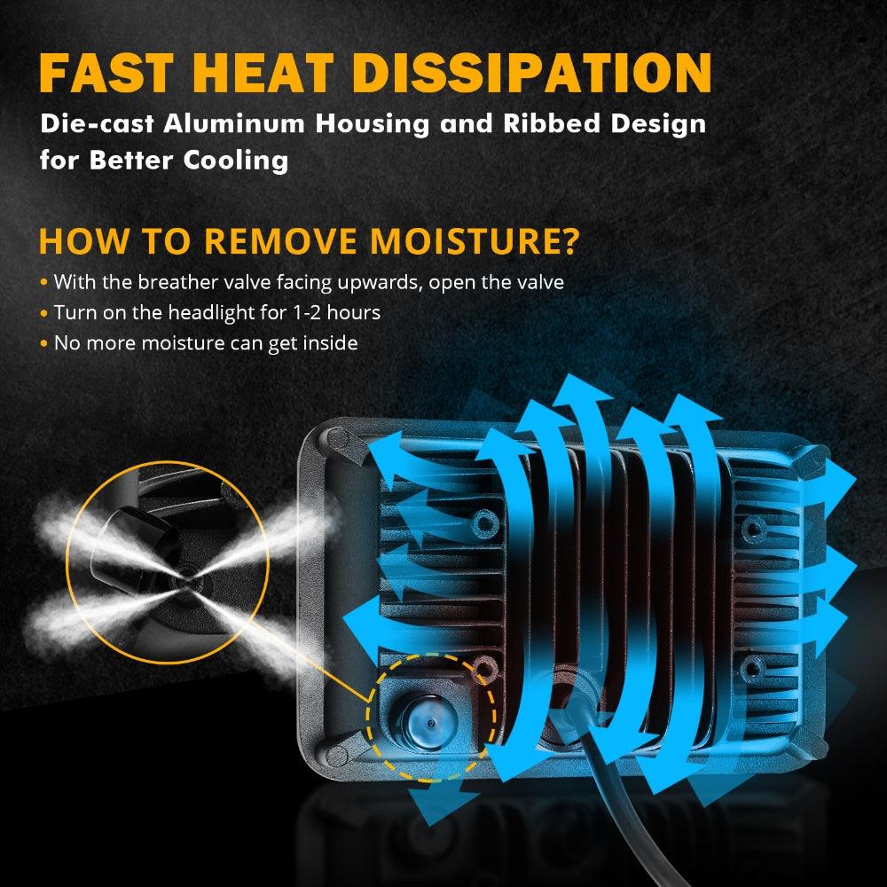 BUILT TO LAST: Durability is a must! These 4x6 inch headlights are designed with an IP67 waterproof rating, so they can withstand heavy rain, fog, or snowstorms. With an exhaust valve on the back to prevent fogging, the die-cast aluminum shell and back heat dissipation design effectively keep the headlights at a stable working temperature, extending the lifespan to over 70,000 hours. So, you can say goodbye to the hassle of replacing your headlights.