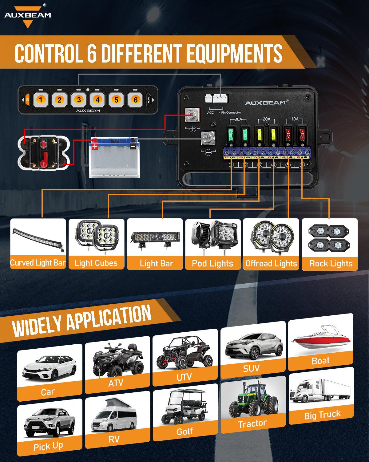 - 6-Gang one-sided outlet switch panel. It allows you to control up to 6 different LED lights or devices. Command all your vehicle accessories by the tap of your finger.