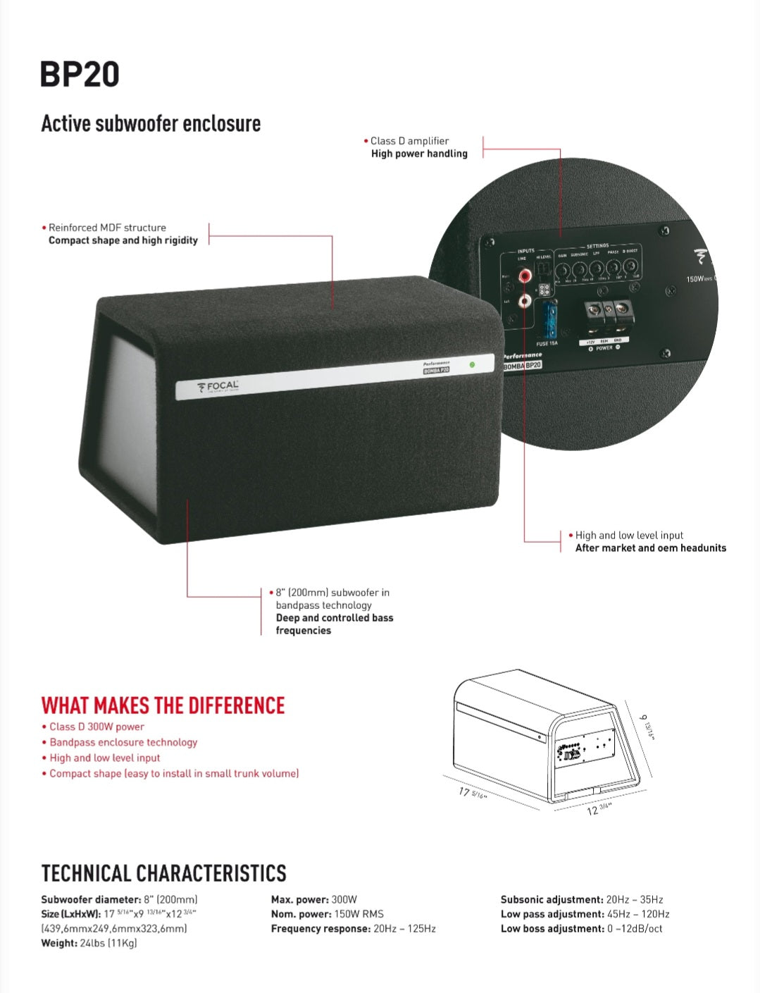 Plongez dans un monde plein de basses profondes et puissantes avec le caisson de basses FOCAL "BOMBA BP20". Ce puissant caisson de basses est conçu pour enrichir votre expérience sonore et vous offrir une expérience audio inégalée. Avec une puissance maximale de 400 watts et un diamètre de 20 cm, le caisson de basses FOCAL offre un son riche et clair qui remplit n'importe quelle pièce de basses profondes et pulsées. Que vous aimiez la musique, les films ou les jeux, ce caisson de basses offre une expérience sonore intense qui vous captivera. La finition de haute qualité et le design élégant du caisson de basses FOCAL « BOMBA BP20 » en font non seulement un point fort sonore, mais aussi un accroche-regard visuel dans votre véhicule ou à la maison. Découvrez une nouvelle dimension sonore avec le caisson de basses FOCAL « BOMBA BP20 » et vivez la musique, les films et les jeux d'une toute nouvelle manière. Offrez-vous le luxe d'un système audio de première classe et plongez-vous dans un monde plein de basses riches et d'aigus clairs.