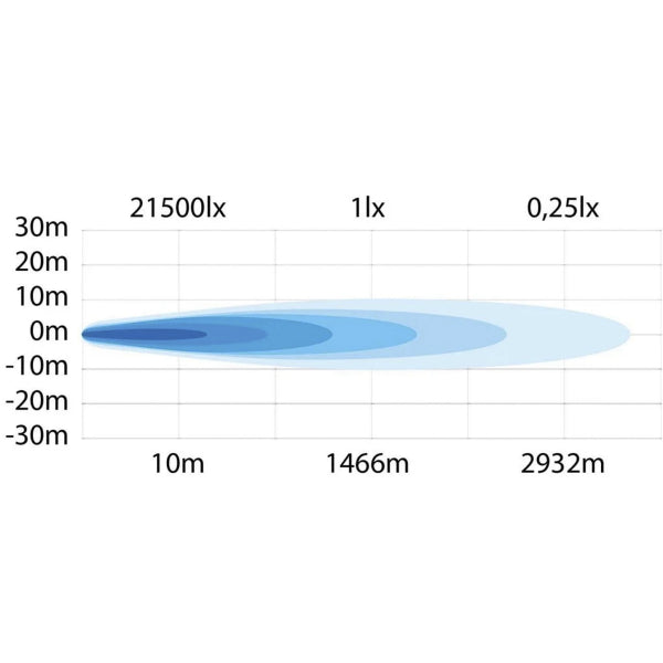 Barre LED incroyablement performante avec un cône lumineux en forme de spot. Lentille sans cadre, feu de position bicolore. Flux lumineux 14 270 lumens, portée 1 466 mètres à 1 lux !