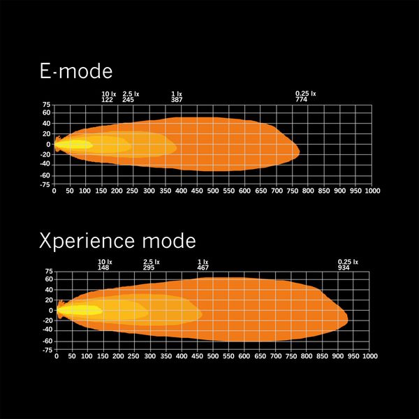 Feu auxiliaire tout-terrain bas et courbé avec un corps élancé, équipé entre autres de deux modes de puissance, d'un large coin combiné et d'un feu de stationnement jaune et blanc. Puissance lumineuse nominale 7050 lm, portée 467 m à 1 lux. Non homologué E !